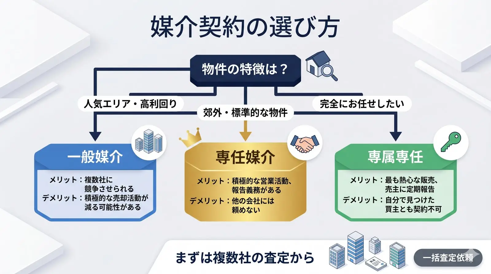 ただし、人気エリア・高利回り物件の場合は、複数社の競争原理を活かせる一般媒介も選択肢です。
