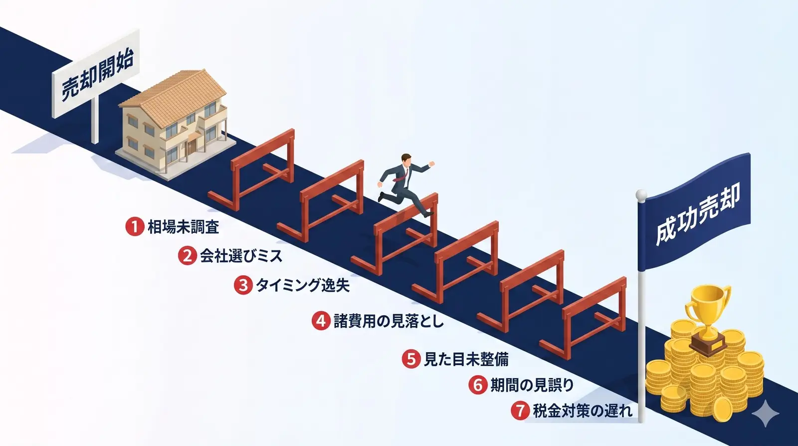 | ⑥ | 売却期間の見誤り | 月44万円のコスト | 6ヶ月前から準備を始めたか |