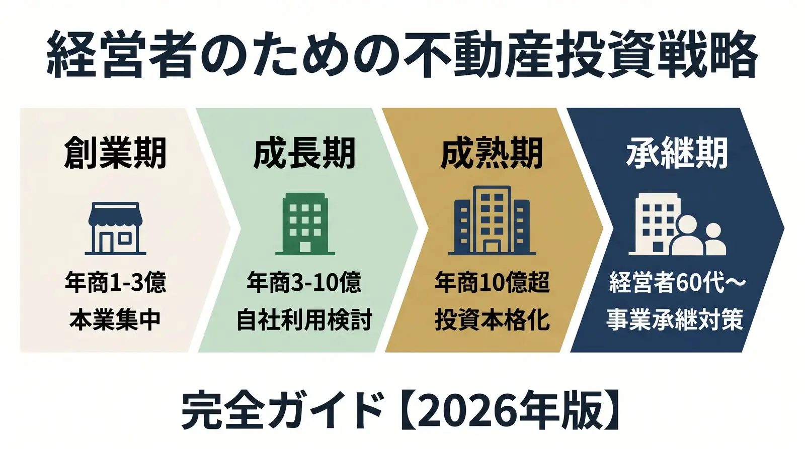 中小企業オーナーの不動産投資戦略は、事業ステージによって最適解が大きく異なります。4つのフェーズ別に整理します。